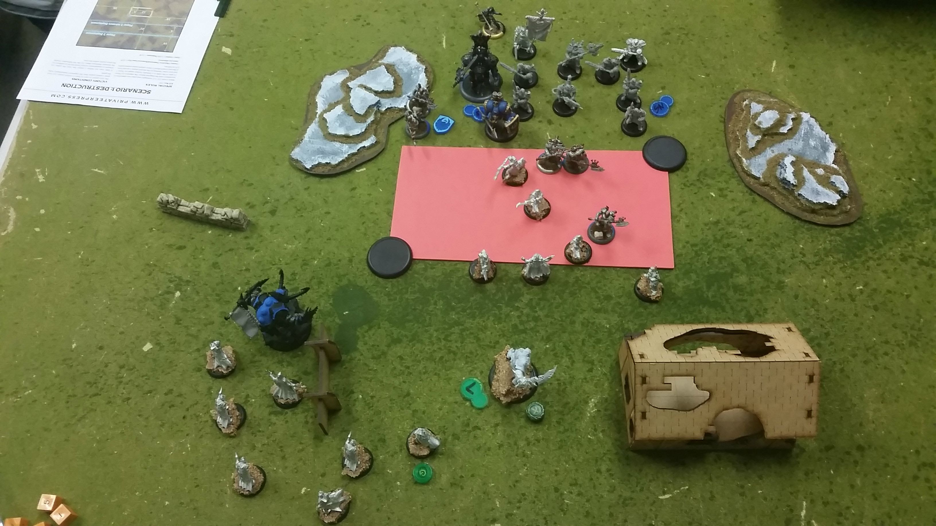 Anyways, the scenario that we played was destruction, and Dave won the roll and chose to go first. I picked the side of the table with a wall on it, and it was time for Cygnar deployment.
